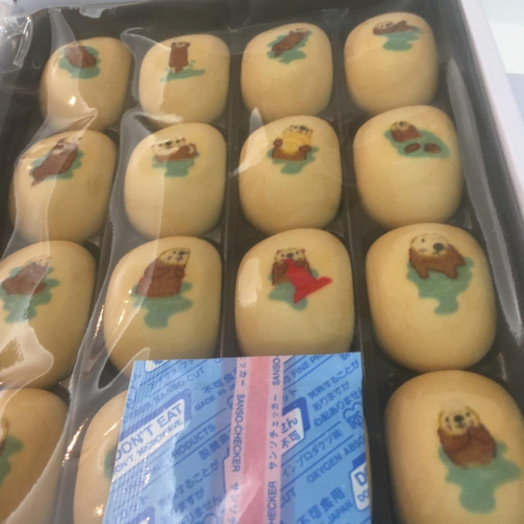 よくあるお土産のお菓子ですが、ひとつづつラッコの絵柄が違います。かわいいです!!