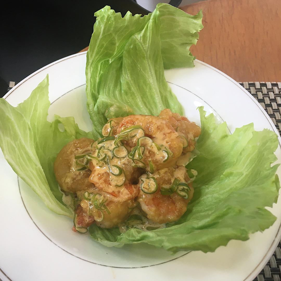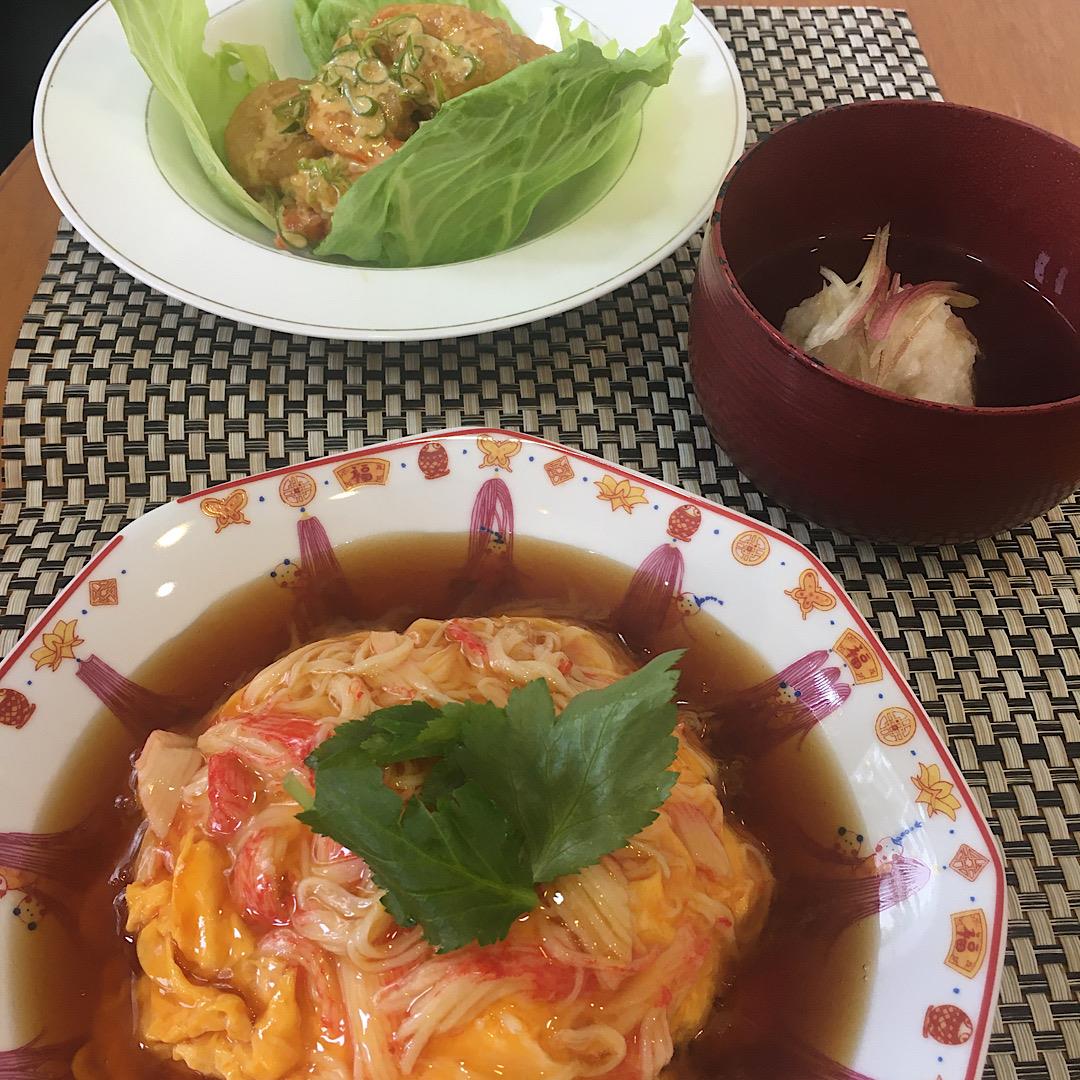 エビマヨと天津飯、もう一品は和食の基本のしんじょのお椀です。
