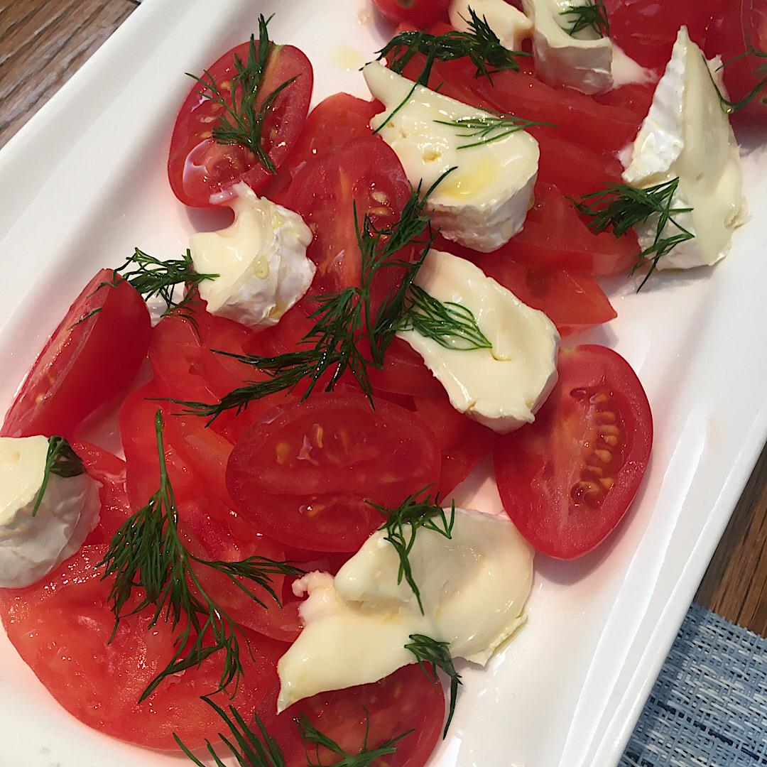 真っ赤に熟したトマトにカマンベールをちらし、オリーブオイルと岩塩、黒コショウを振って、夏のごちそうです。