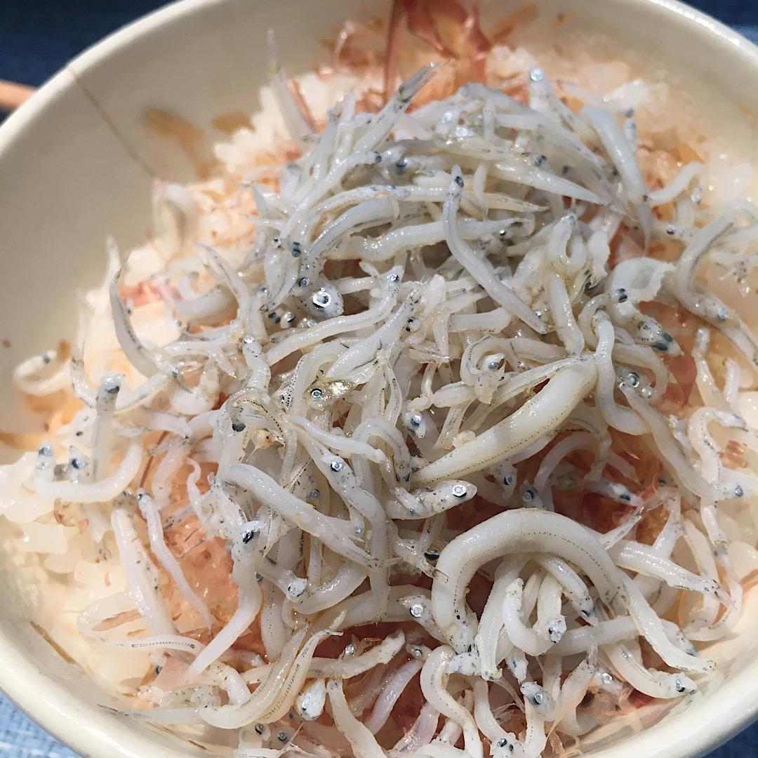 温かいご飯にカツオパックの半分ぐらいをふりかけ、釜揚げシラスをまんべんなくふりかけ、だし醤油をひと回しかける。ぼく考えた~💛