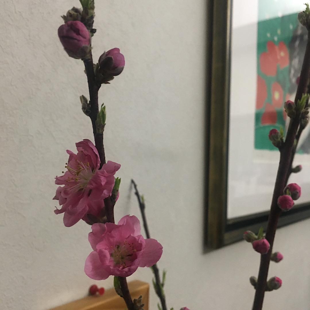 お店のプランターに入れる草花を買いに行ったお花市場で、桃の花の枝を見つけ思わず購入。