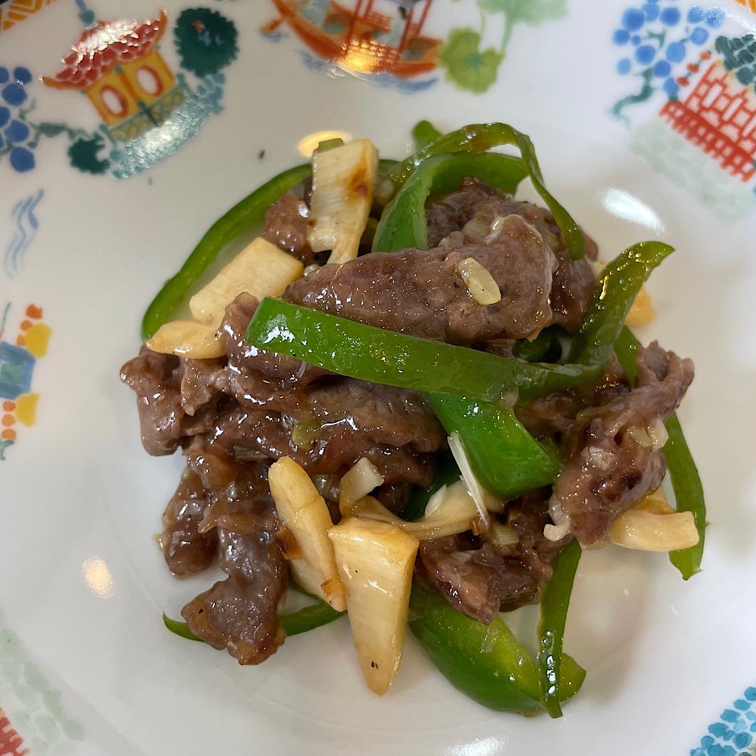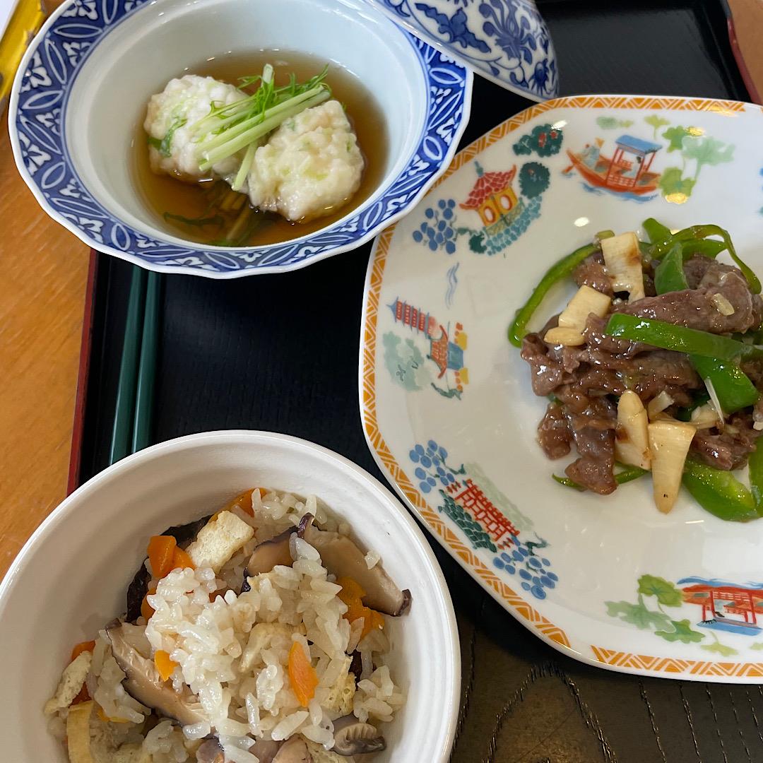 青椒肉絲、炊き込みおこわ、エビしんじょの3品
